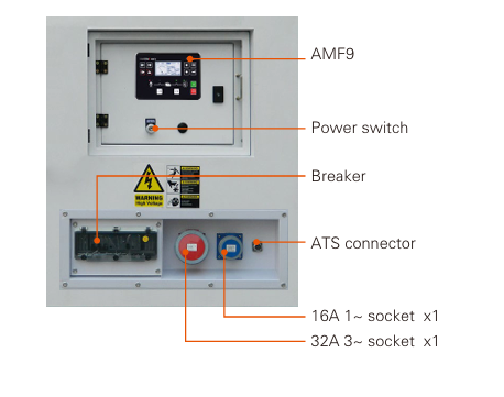 Afișajul multifuncțional integrat (MRS10) include un indicator de tensiune și curent, precum și un indicator de protecție a generatorului, un contor de ore, un indicator de încărcare a bateriei și un indicator al orelor de funcționare a motorului. Dacă la dispozitivul desemnat este conectată și o cutie ATS, generatorul industrial poate fi pornit automat imediat ce alimentarea principală cu energie electrică este întreruptă.